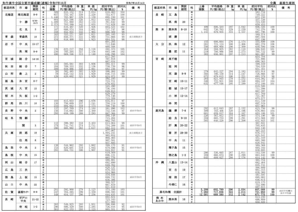 全農によると、令和7年月10月14日時点での全国主要市場取引状況の前月比はそれぞれ、牝99%、雄99%です。