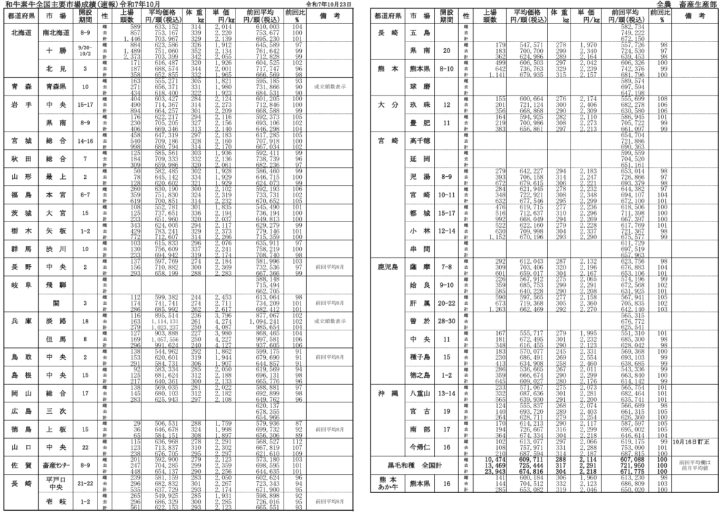 全農によると、令和7年月10月23日時点での全国主要市場取引状況の前月比はそれぞれ、牝100%、雄100%です。