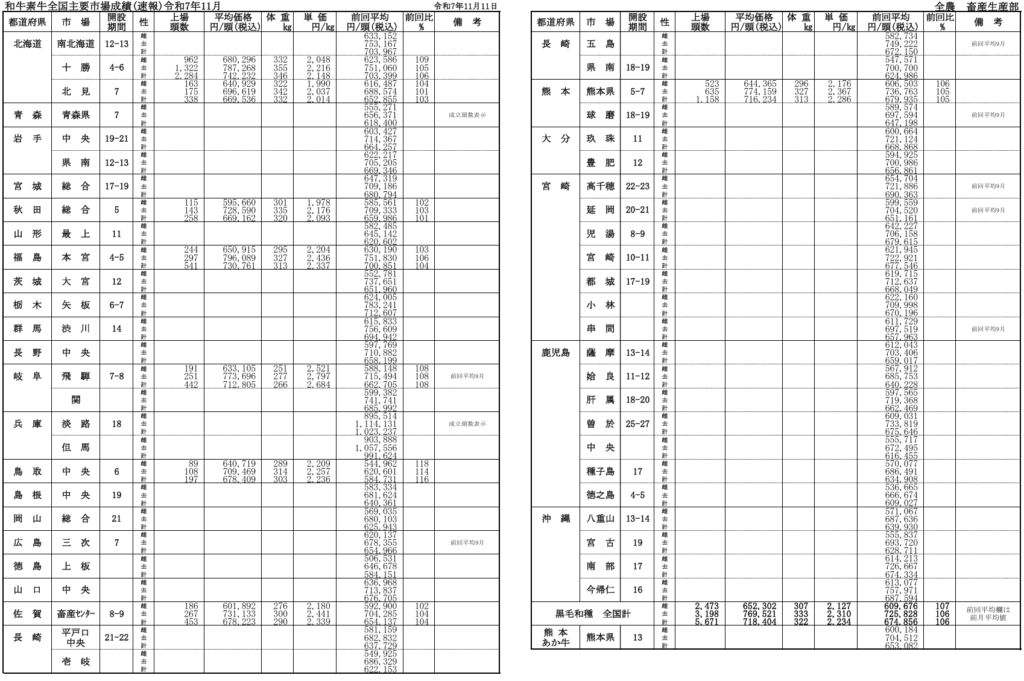 全農によると、令和7年月11月11日時点での全国主要市場取引状況の前月比はそれぞれ、牝107%、雄106%です。