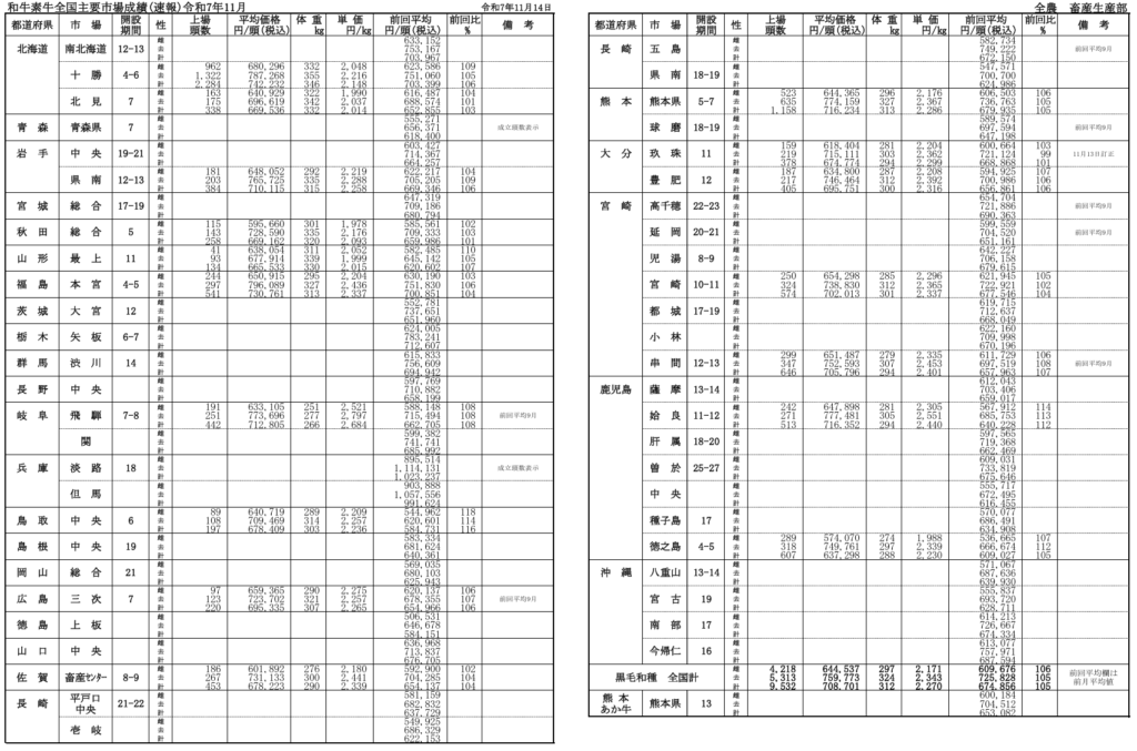 全農によると、令和7年月11月17日時点での全国主要市場取引状況の前月比はそれぞれ、牝106%、雄105%です。