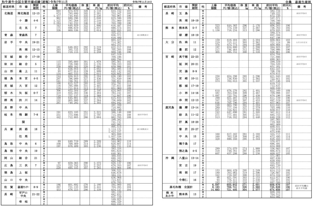 全農によると、令和7年月11月18日時点での全国主要市場取引状況の前月比はそれぞれ、牝107%、雄106%です。