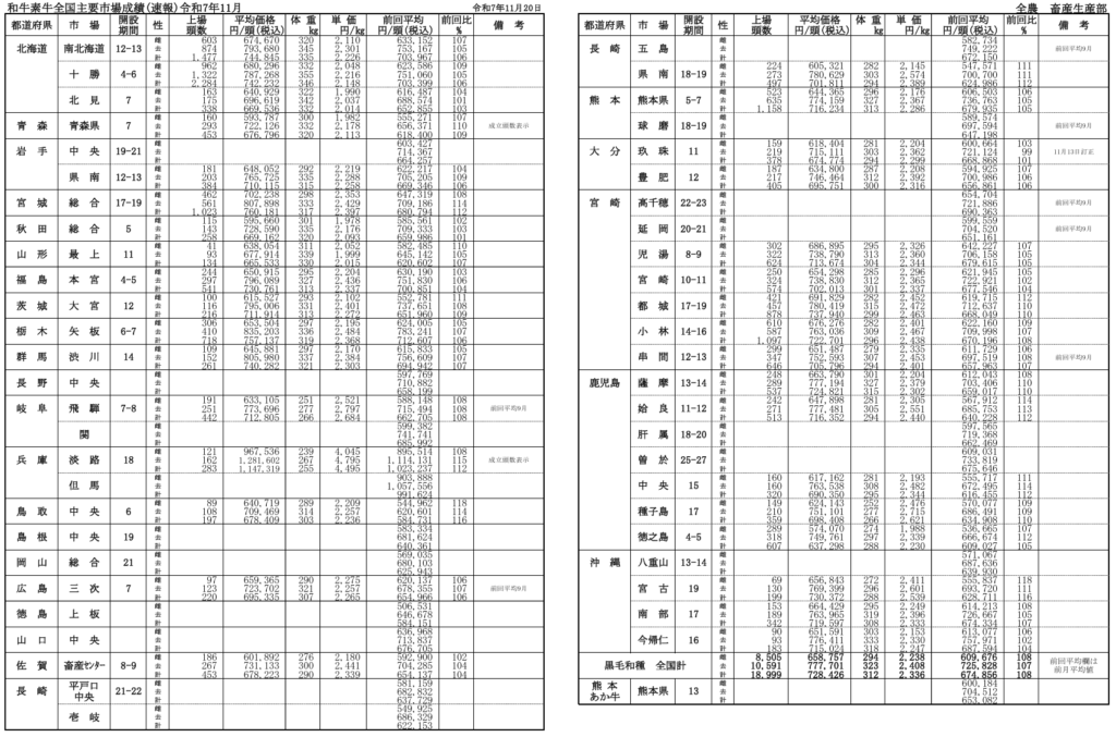 全農によると、令和7年月11月20日時点での全国主要市場取引状況の前月比はそれぞれ、牝108%、雄107%です。