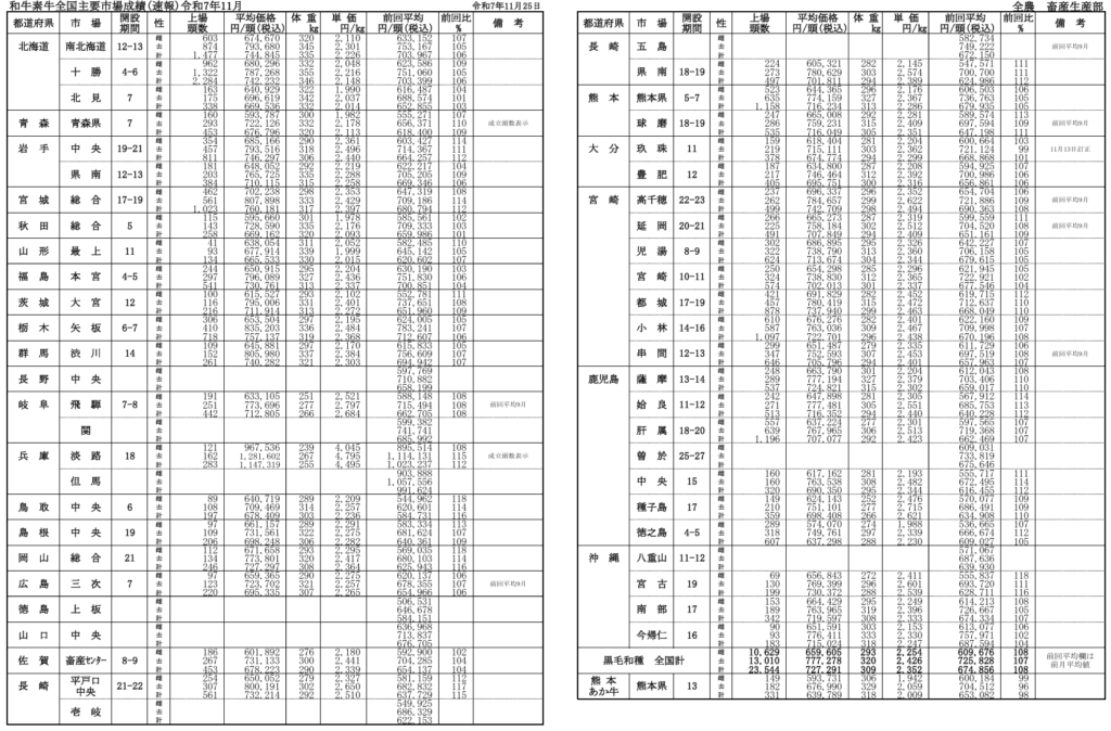 全農によると、令和7年月11月25日時点での全国主要市場取引状況の前月比はそれぞれ、牝108%、雄107%です。