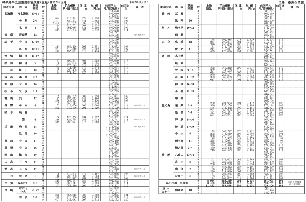 全農によると、令和7年月12月12日時点での全国主要市場取引状況の前月比はそれぞれ、牝106%、雄103%です。