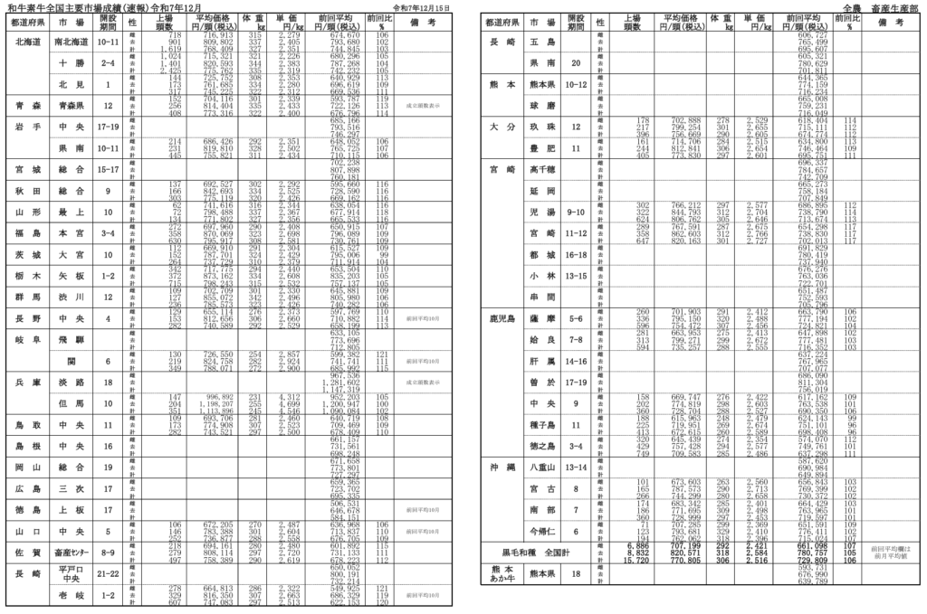 全農によると、令和7年月12月15日時点での全国主要市場取引状況の前月比はそれぞれ、牝107%、雄105%です。
