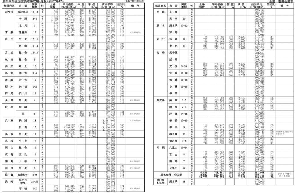 全農によると、令和7年月12月18日時点での全国主要市場取引状況の前月比はそれぞれ、牝107%、雄105%です。