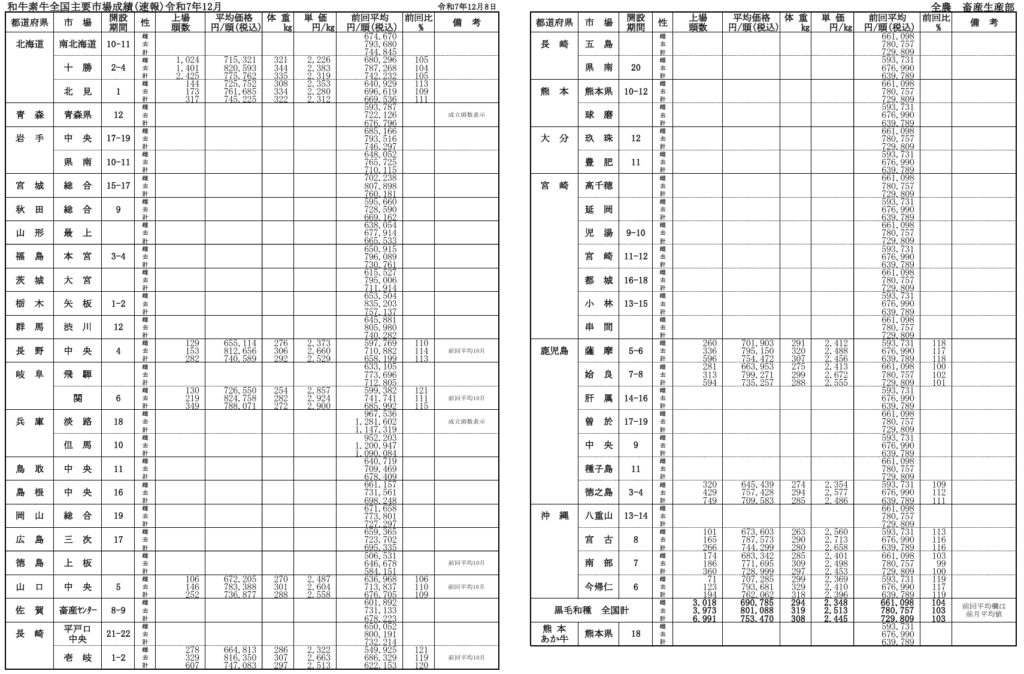 全農によると、令和7年月12月8日時点での全国主要市場取引状況の前月比はそれぞれ、牝104%、雄103%です。