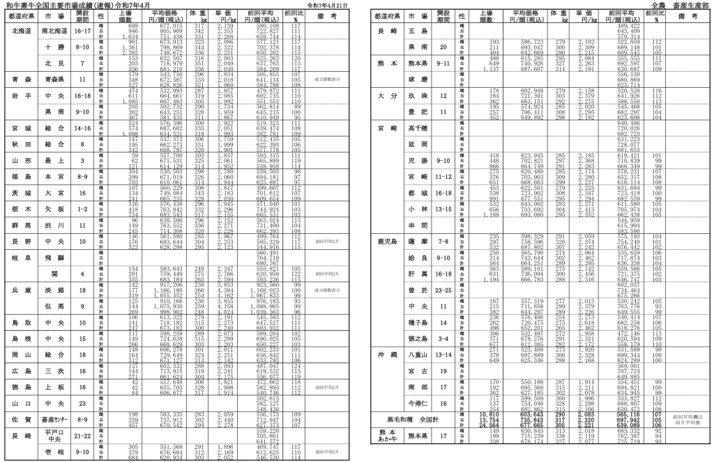 全農によると、令和7年4/21時点での全国主要市場取引状況の前月比はそれぞれ、牝107%、雄105%です。