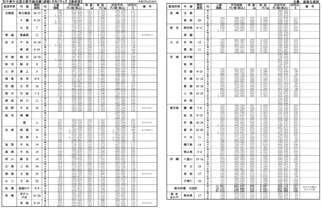 全農によると、令和7年4/28時点での全国主要市場取引状況の前月比はそれぞれ、牝107%、雄105%です。