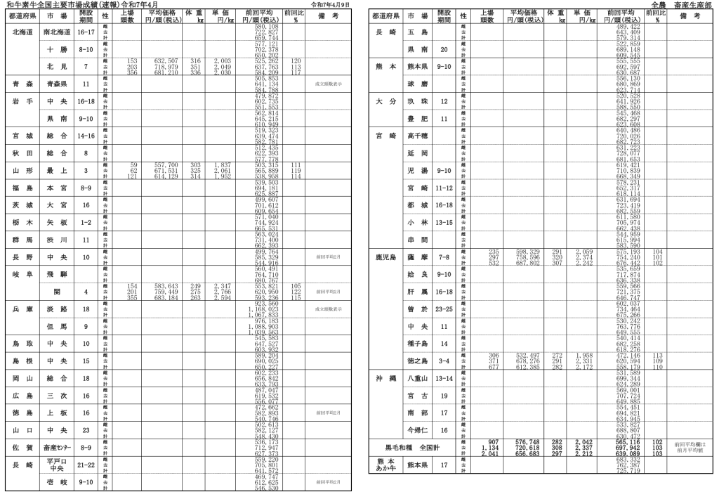全農によると、令和7年3/27時点での全国主要市場取引状況の前月比はそれぞれ、牝102%、雄103%です。