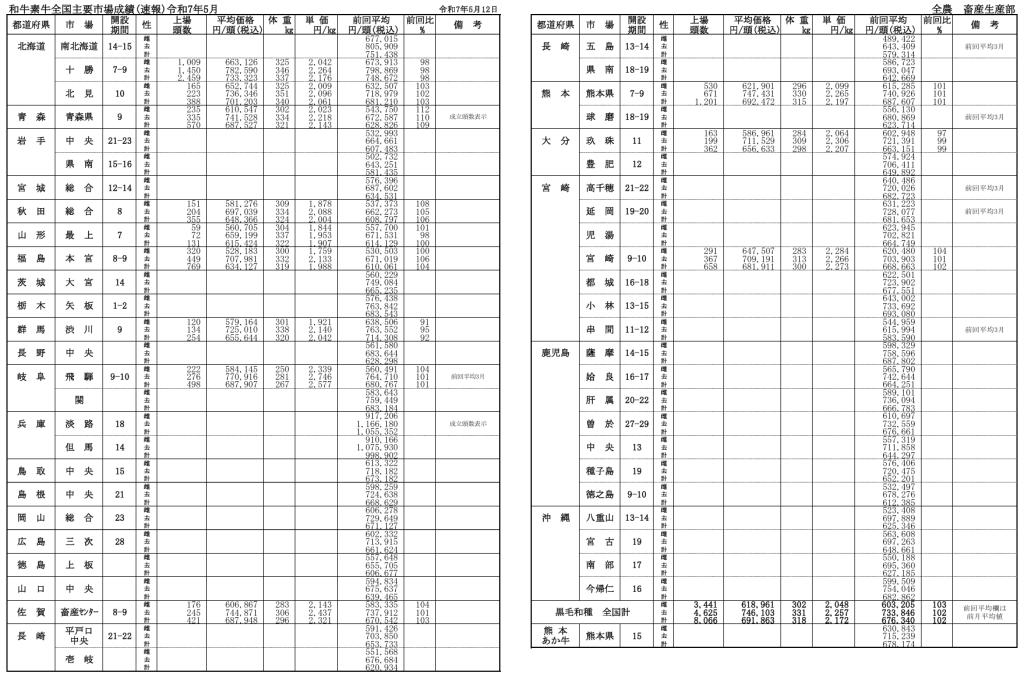 全農によると、令和7年5月12日時点での全国主要市場取引状況の前月比はそれぞれ、牝103%、雄102%です。