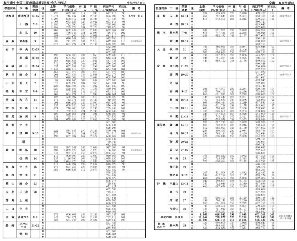 全農によると、令和7年5月19日時点での全国主要市場取引状況の前月比はそれぞれ、牝103%、雄101%です。
