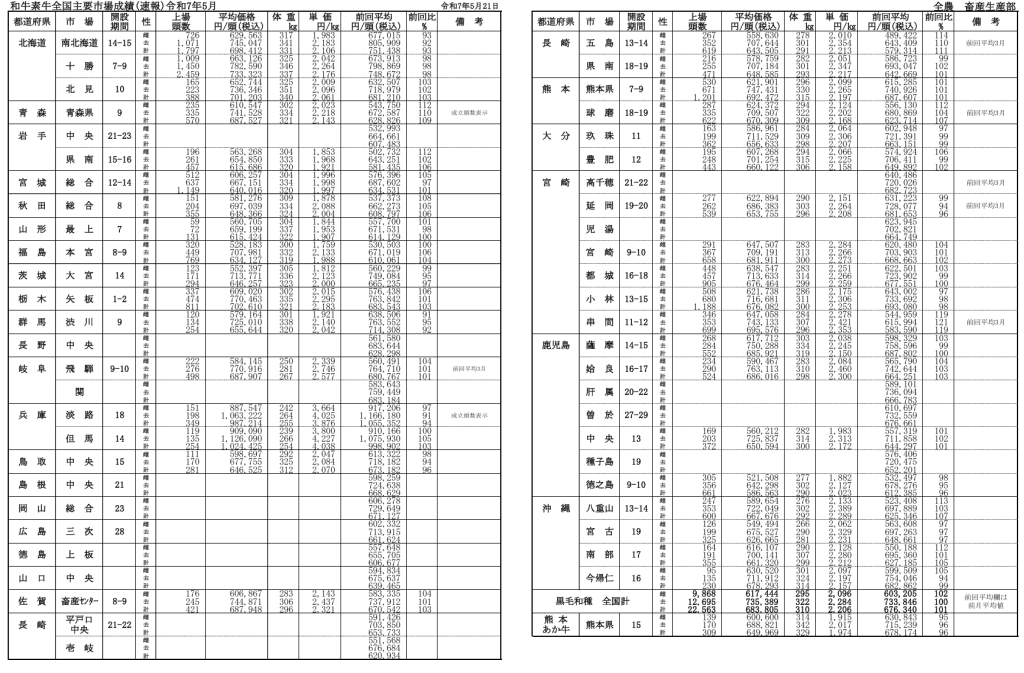 全農によると、令和7年5月21日時点での全国主要市場取引状況の前月比はそれぞれ、牝102%、雄100%です。