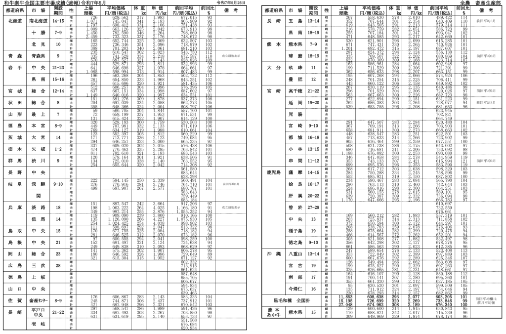 全農によると、令和7年5月26日時点での全国主要市場取引状況の前月比はそれぞれ、牝101%、雄99%です。