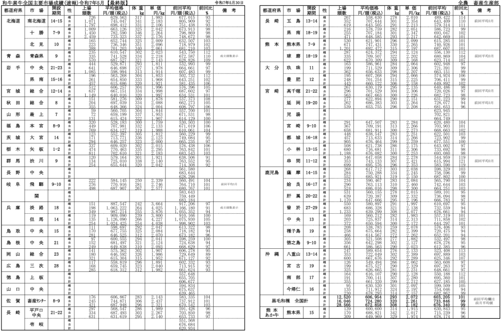 全農によると、令和7年5月30日時点での全国主要市場取引状況の前月比はそれぞれ、牝101%、雄99%です。