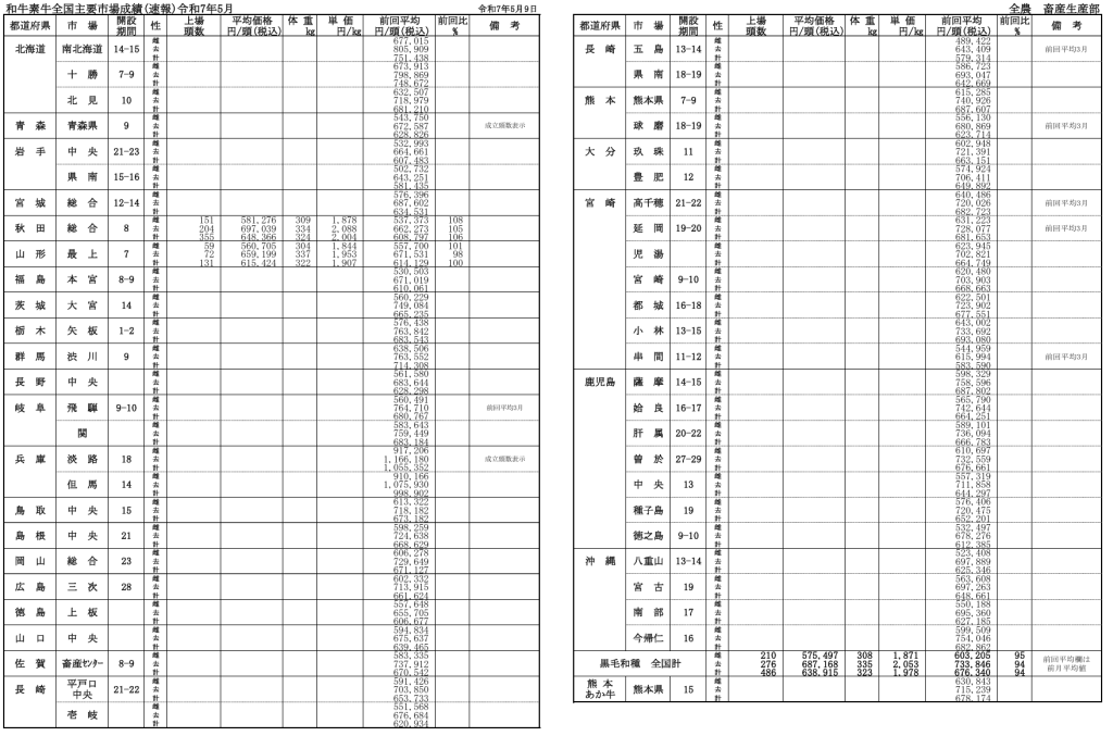 全農によると、令和7年5月9日時点での全国主要市場取引状況の前月比はそれぞれ、牝95%、雄94%です。