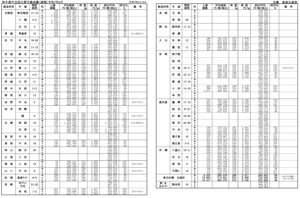 全農によると、令和7年6月19日時点での全国主要市場取引状況の前月比はそれぞれ、牝98%、雄99%です。