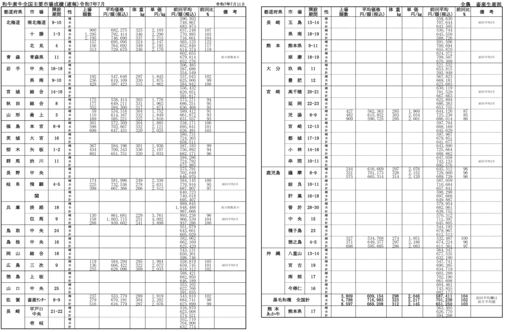 全農によると、令和7年月7月11日時点での全国主要市場取引状況の前月比はそれぞれ、牝104%、雄102%です。