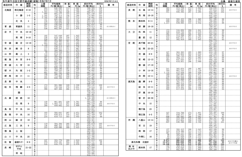 全農によると、令和7年月7月18日時点での全国主要市場取引状況の前月比はそれぞれ、牝100%、雄99%です。