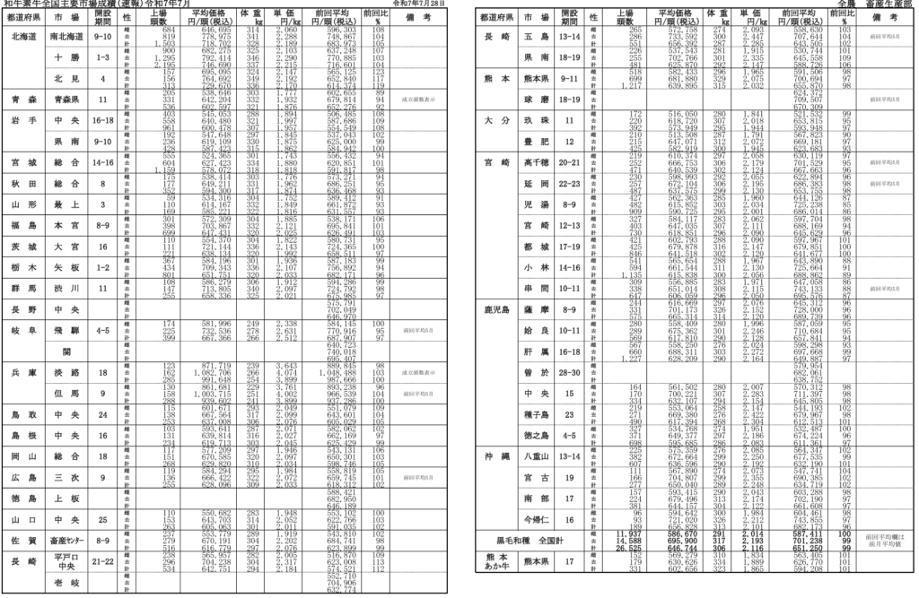 全農によると、令和7年月7月28日時点での全国主要市場取引状況の前月比はそれぞれ、牝100%、雄99%です。