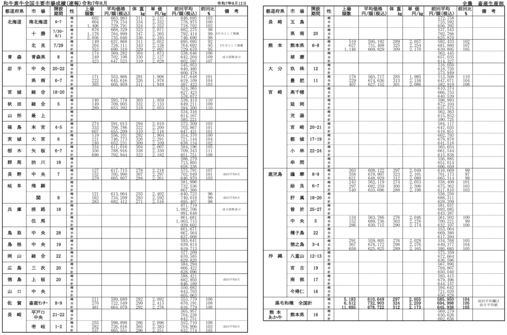 全農によると、令和7年月8月12日時点での全国主要市場取引状況の前月比はそれぞれ、牝104%、雄105%です。