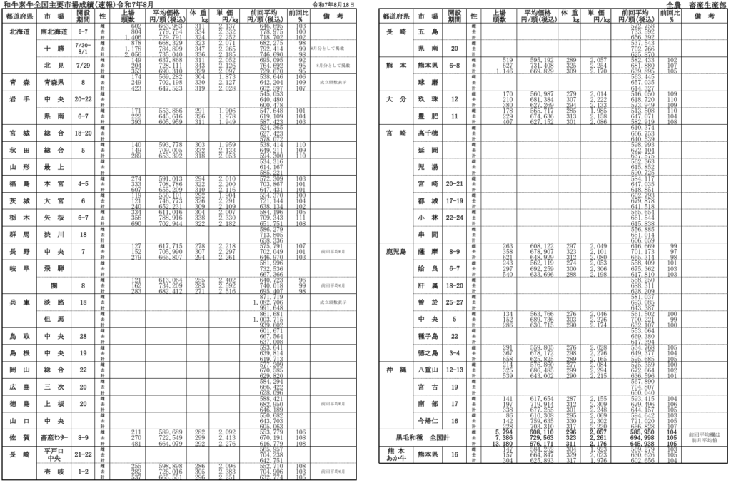 全農によると、令和7年月8月18日時点での全国主要市場取引状況の前月比はそれぞれ、牝104%、雄105%です。