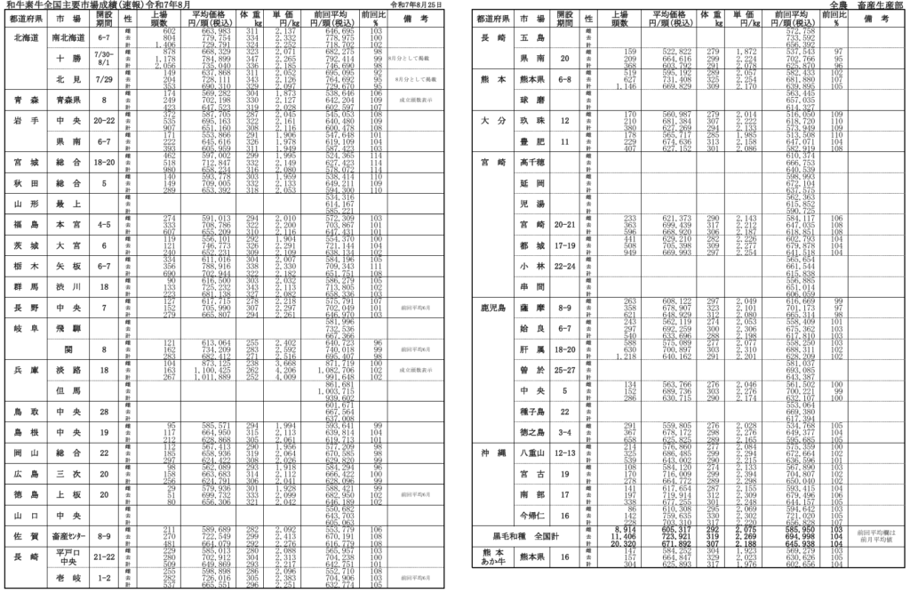全農によると、令和7年月8月25日時点での全国主要市場取引状況の前月比はそれぞれ、牝103%、雄104%です。