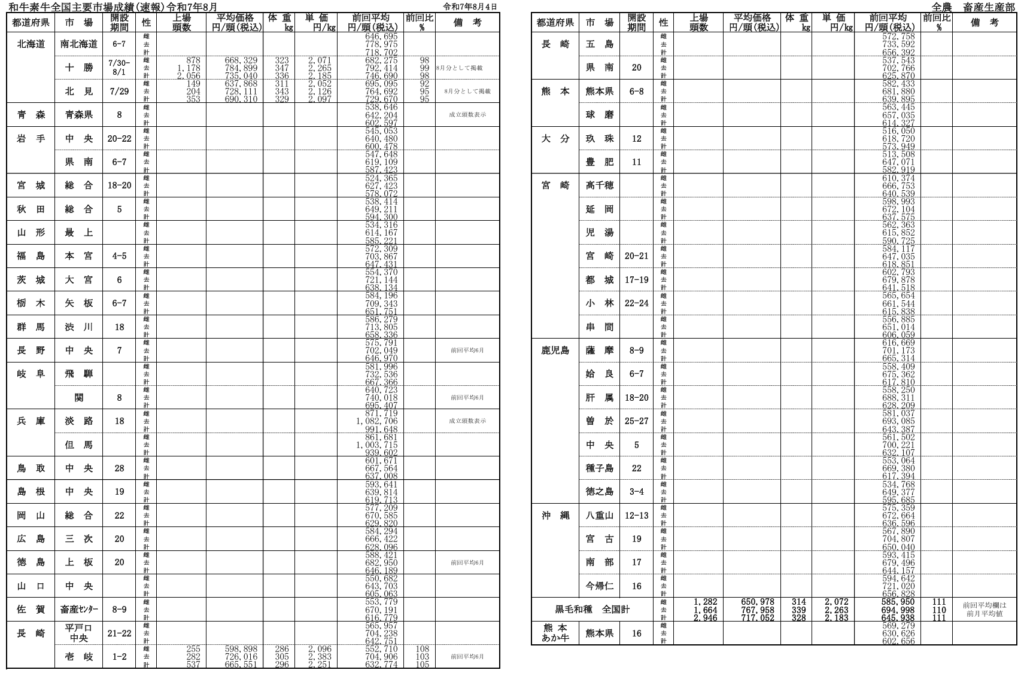 全農によると、令和7年月8月4日時点での全国主要市場取引状況の前月比はそれぞれ、牝111%、雄110%です。