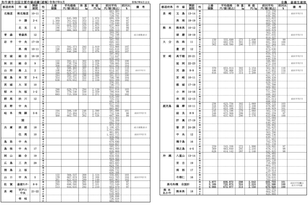 全農によると、令和7年月9月12日時点での全国主要市場取引状況の前月比はそれぞれ、牝101%、雄100%です。