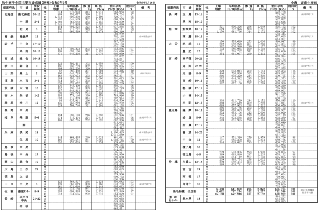全農によると、令和7年月9月16日時点での全国主要市場取引状況の前月比はそれぞれ、牝101%、雄101%です。