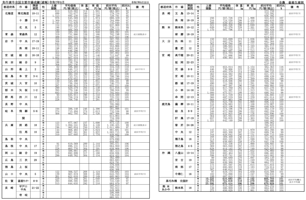 全農によると、令和7年月9月22日時点での全国主要市場取引状況の前月比はそれぞれ、牝101%、雄100%です。