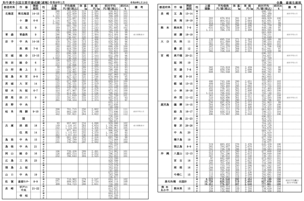 全農によると、令和8年月1月19日時点での全国主要市場取引状況の前月比はそれぞれ、牝100%、雄100%です。