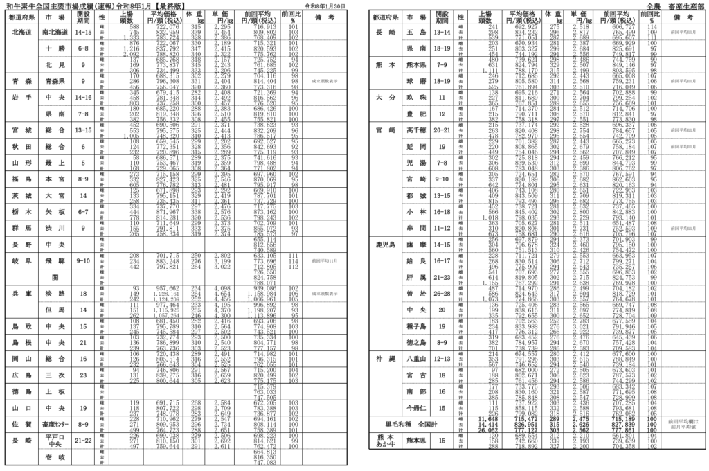 全農によると、令和8年月1月30日時点での全国主要市場取引状況の前月比はそれぞれ、牝100%、雄100%です。