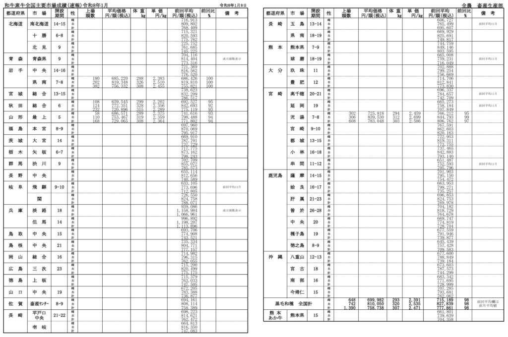 全農によると、令和8年月1月8日時点での全国主要市場取引状況の前月比はそれぞれ、牝98%、雄98%です。