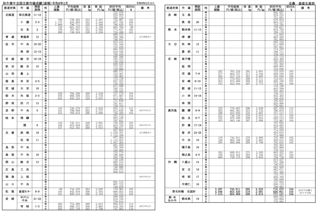 全農によると、令和8年月2月10日時点での全国主要市場取引状況の前月比はそれぞれ、牝104%、雄103%です。
