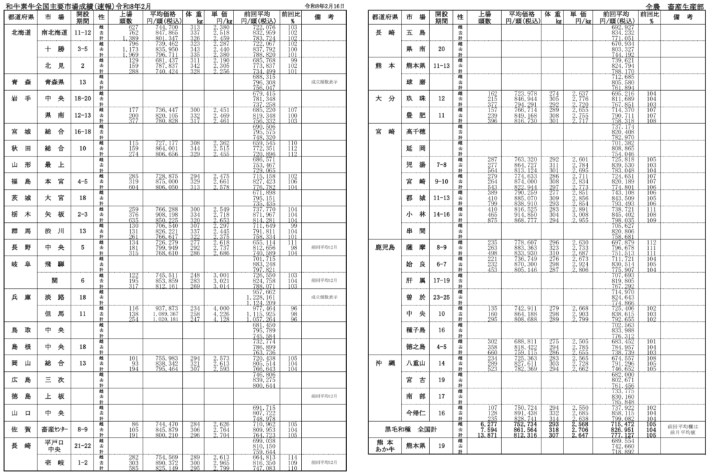 全農によると、令和8年月2月16日時点での全国主要市場取引状況の前月比はそれぞれ、牝105%、雄104%です。