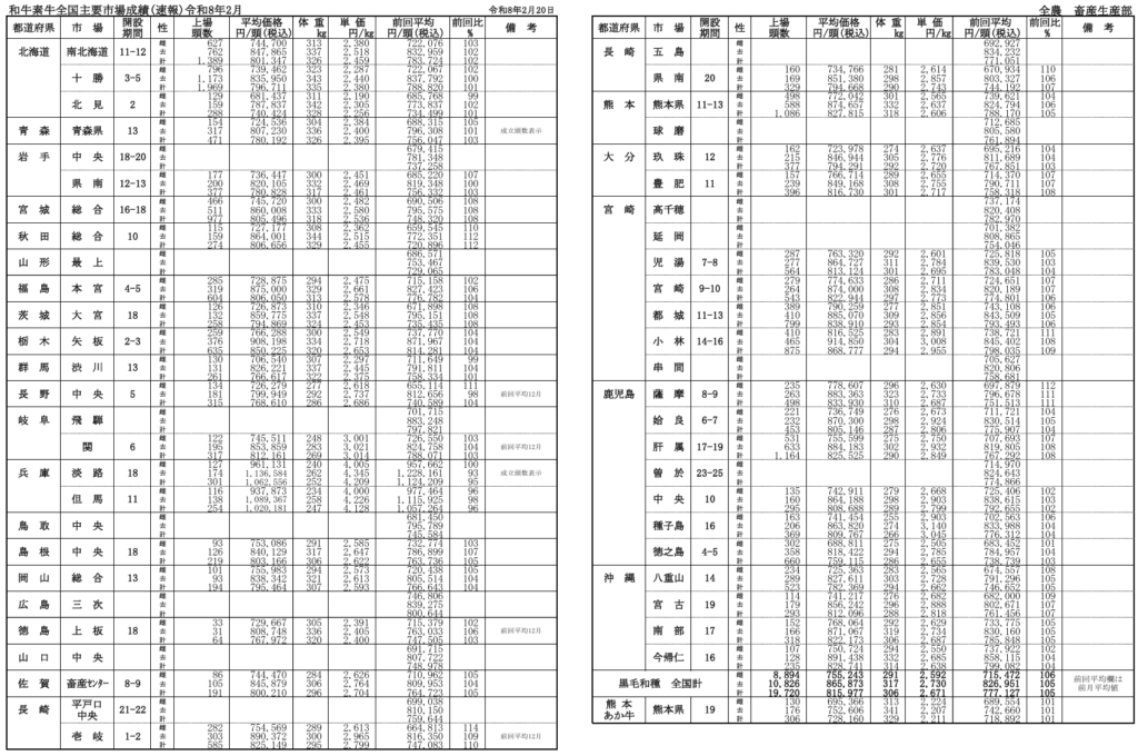 全農によると、令和8年月2月20日時点での全国主要市場取引状況の前月比はそれぞれ、牝106%、雄105%です。