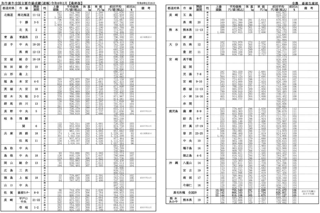 全農によると、令和8年月2月25日時点での全国主要市場取引状況の前月比はそれぞれ、牝106%、雄105%です。