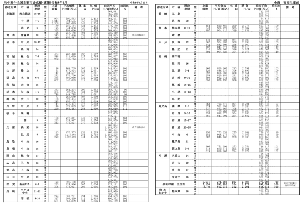全農によると、令和8年月4月13日時点での全国主要市場取引状況の前月比はそれぞれ、牝99%、雄100%です。