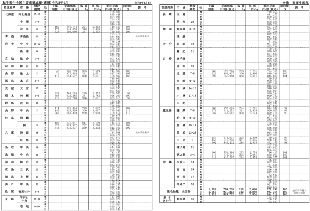 全農によると、令和8年月4月8日時点での全国主要市場取引状況の前月比はそれぞれ、牝100%、雄100%です