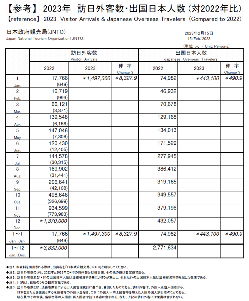 JNTOによると、1 月の訪⽇外客数は対 2019 年同月比 55.7%の 1,497,300 人となりました。クリスマス休暇等により訪⽇旅⾏需要が⾼まる 12 月に比べ、例年 1 月は欧米市場を中心に閑散期にあた