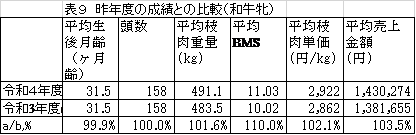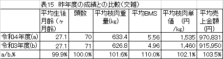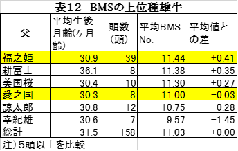 売上改善の枝重以外のもう一つ重要な要素であるロース芯の脂肪交雑で肉質の良さを表すBMSでは、当団の福之姫はトップの11.44、愛之国は№4の11.00となっていました