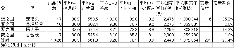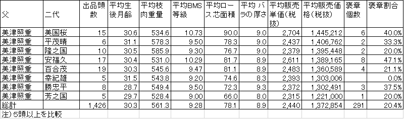 少ない頭数ですが、5頭以上で比較しました。父と二代との相性の参考(頭数が少ないと再現性は小さくなります)とします。