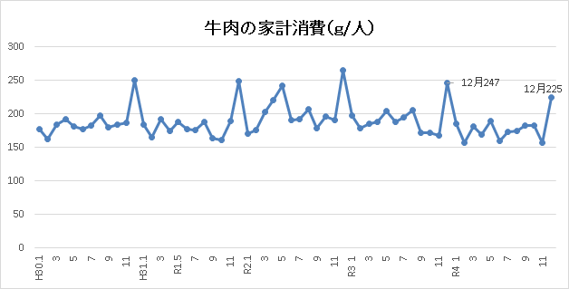 R4.12は季節要因(年末)で11月より増えていますが、前年同月と比べるとインフレ(食料品値上げなど)の影響で伸び悩んでいます。