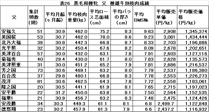○去勢と共通上位は、安福久×平茂勝(去勢4回、牝5回)、北乃大福×平茂勝(去勢、牝とも2回)、北平安×平茂勝(去勢、牝とも2回)でした。