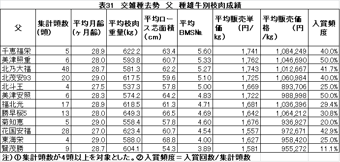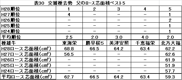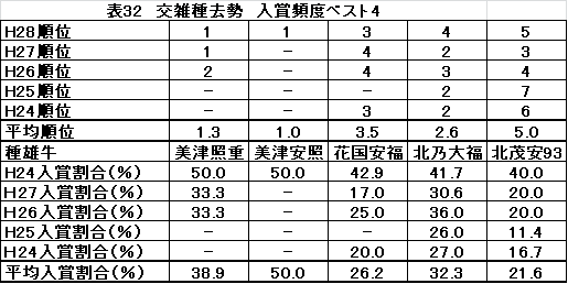 (4)交雑種去勢は、北乃大福、北茂安93が5年間通じて、花国安福が通算4年、美津照重が通算3年と入賞回数が上位で安定していました。