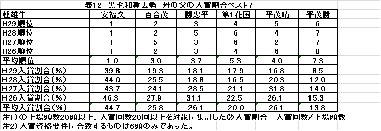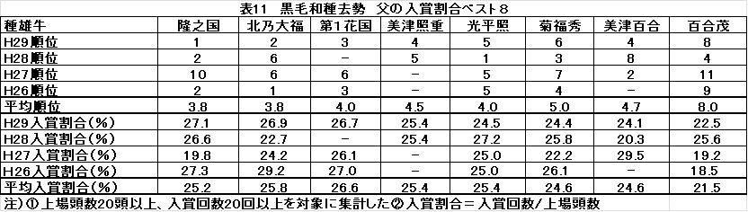 ○安福久、百合茂、勝忠平、第1花国、平茂晴および平茂勝が上位で安定していました。ただし、平茂勝の入賞割合は年々漸減し、平成29年は10%以下でした。