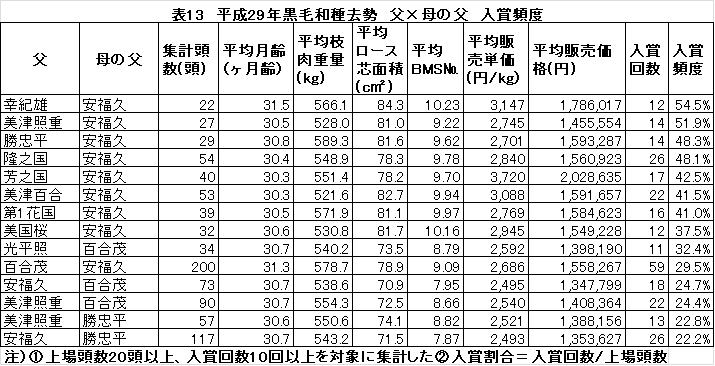 ○上位の掛け合わせの母の父に安福久がずらりと並んでいました。中でも父が幸紀雄、美津照重との駆け合わせの入賞頻度が50%を超えていることは驚異的でした。