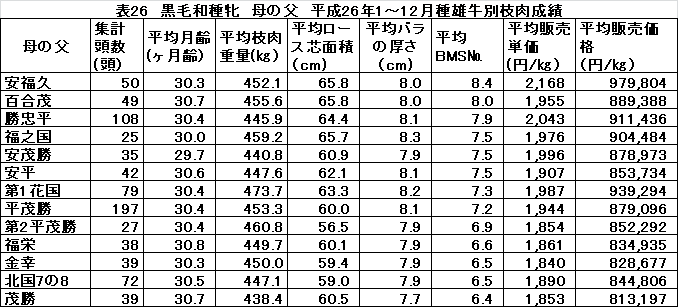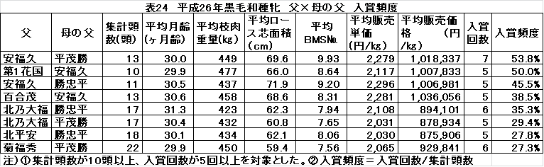 ○北乃大福×勝忠平(H26、H25)、北乃大福×平茂勝(H26、H25)、北平安×平茂勝は3年間のうち2年上位でした。