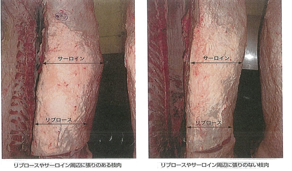 ○胴体全体に丸み、厚み(ハリ)のあるものが好ましい。リブロース・サーロイン部分の厚み、第6~第7肋骨間の切断部分の下の部分(カタ)の厚みを見ます。丸みがあることは、ロース芯、芯周囲筋のサイズが厚くなること、筋肉内の脂肪交雑が充実して光沢テリが優れているための必要条件です。充分条件と言えないのは、脂肪が筋肉内でなく、筋間、皮下で厚大していることもあるからです。